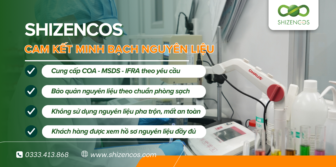 Với nhiều năm kinh nghiệm trong nghiên cứu và phát triển công thức, Shizencos xây dựng hệ thống cung ứng cosmetic ingredients đạt chuẩn quốc tế, minh bạch, truy xuất rõ ràng và được kiểm định theo quy trình nghiêm ngặt.