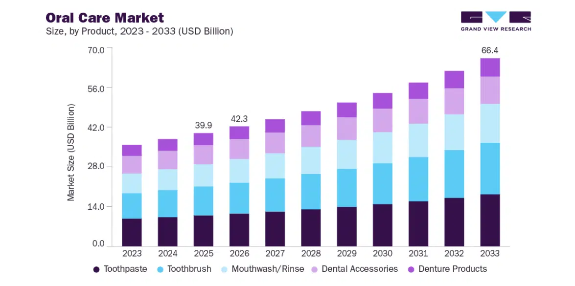 Thị trường chăm sóc răng miệng dự kiến quy mô toàn cầu ước tính đạt 42,3 tỷ USD vào năm 2026 và tăng dần lên mức 66,4 tỷ USD vào năm 2033, với tốc độ tăng trưởng kép hàng năm (CAGR) là 6,65 % trong giai đoạn dự kiến. Sự tăng trưởng này được thúc đẩy bởi nhận thức ngày càng cao về vệ sinh răng miệng, sự gia tăng tỷ lệ mắc các bệnh về răng như sâu răng, rối loạn nha chu (nhiễm trùng nướu), và sự chú trọng ngày càng tăng vào chăm sóc sức khỏe dự phòng của người tiêu dùng. Bên cạnh đó, sự đổi mới sản phẩm từ các công thức kem đánh răng tiên tiến, bàn chải đánh răng điện và các giải pháp làm trắng răng thẩm mỹ, cùng với sự gia tăng dân số đô thị và thu nhập khả dụng cũng thúc đẩy sự tăng trưởng của thị trường toàn cầu. Báo cáo từ Grand View Research về Oral Care Market cho thấy: